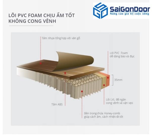 - Cánh của loại cửa này được làm từ nhựa Hàn Quốc ABS có màu sắc phong phú và đa dạng, trong đó thì màu vân gỗ là màu được nhiều người lựa chọn nhất. Cánh cửa dày 35mm được ghép lại từ 2 tấm nhựa ABS, ở giữa 2 tấm nhựa này 1 lớp Honeycomb. Lớp Honeycomb này có khả năng cách âm, cách nhiệt đồng thời có thể chịu lực tốt. Bên trong cửa còn được gia tăng thêm lõi LXL giúp hạn chế tối đa tình trạng cong vênh của cửa. Trong cùng của cánh cửa là lõi PVC Foam.
