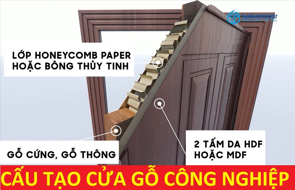 Cửa gỗ công nghiệp với phần khung xương gỗ tự nhiên, bên trong được chèn bằng giấy tổ ong mục đích nhằm tăng khả năng cách âm. Trong đó phần bề mặt được ép cứng ván gỗ công nghiệp, được dán bằng keo chuyên dụng để tránh xảy ra tình trạng bong keo, hở ván, cong vênh….Hiện nay, các mẫu cửa gỗ công nghiệp 2 cánh được sử dụng rộng rãi và đang dần thay thế gỗ tự nhiên. Sản phẩm được sử dụng trong các công trình như: chung cư, nhà phố, văn phòng, ….